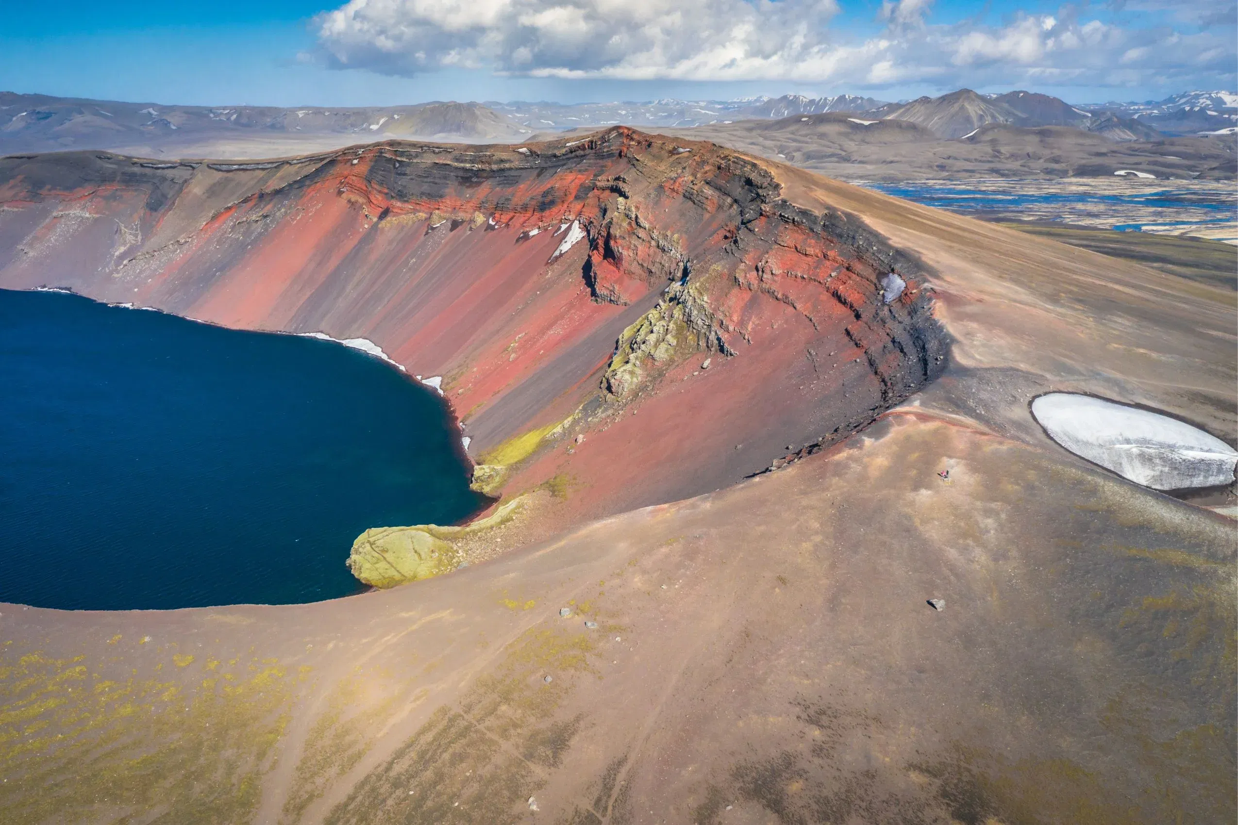 Continuing our journey, we arrive at the 'pearls of the highlands,' the captivating Ljótipollur, an explosion crater lake. Despite its name, which translates as 'Ugly puddle,' its crimson crater walls offer a sight of striking beauty that will undoubtedly inspire your camera.